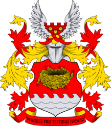 Na czerwonym polu, ponad srebrną podniesioną podstawą ciętą w pięć przewracających się fal, złote gniazdo z sześcioma kłosami zboża na jego obwodzie. Klejnot : Hełm turniejowy zwieńczony złoto-czerwonym zawojem, z którego wyrastają dwa srebrne orle skrzydła, pomiędzy którymi blankowany mur obronny z czerwonych cegieł i o czarnych fugach, na którym trzy złote monety w układzie litery V, każda z wizerunkiem jednej kropli. Labry: Czerwone podbite złotem. Poniżej na wstędze dewiza: MAIORES PRO TESTIBUS HABETO.