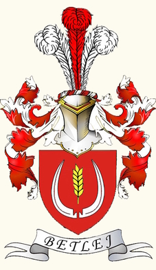 W polu czerwonym, pomiędzy dwoma srebrnymi kosami ustawionymi na kształt podkowy, barkiem w dół, złoty kłos zboża w słup złożony. Na hełmie ozdobionym nałęczką czerwono-srebrną, trzy pióra strusie w barwach na przemian srebrno-czerwono-srebrnych. Labry w barwie czerwonej podbite srebrem.