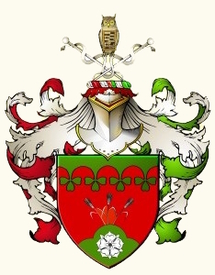 W czerwonym, pod zieloną głowicą o czterech wyciągniętych w dół trójlistnych koniczynkach, zielone trójwzgórze obłożone srebrną różą z którego wzrastają trzy złote kłosy w wachlarz. Klejnot, z nałęczki w barwach przemiennych srebrno-czerwono-zielonych, wyrastają dwa srebrne, oplecione dwoma srebrnymi wężami. skrzyżowane sztaby eskulapa. Pomiędzy nimi sowa złota na wprost. Labry, czerwono-srebrne, zielono-srebrne.