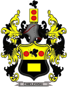 Tarcza herbowa dzielona w pas w barwach złoto-czarnych. W polu górnym trzmiel czarny w locie skierowany w prawo, pomiędzy dwoma czerwonymi kwiatami róży. W dolnym czarnym polu złoty prostokąt. Klejnot, taki sam trzmiel siedzący na złotym prostokącie w słup, obłożonym dwoma czerwonymi kwiatami róży. Labry w barwach czarno-złotych.