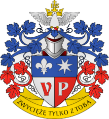 Niebiesko-srebrno-czerwona tarcza, dzielona w pas, dół w słup. W 1, heraldyczna lilia obok siedmioramiennej gwiazdy, obie srebrnej barwy. W 2, czerwona majuskuła litery V, w 3, srebrna majuskuła litery P. Klejnot: na nałęczce niebiesko-srebrno-czerwonej, symbol Ducha Świętego w postaci białej gołębicy z rozpostartymi skrzydłami, na których wsparta złota korona z monogramem JHS, zwieńczonym krzyżem takiej samej barwy. Labry: w postaci liści winogrona, góra niebieskie dół czerwone, podbite srebrem. U dołu na złotej wstędze maksyma ZWYCIĘŻĘ TYLKO Z TOBĄ.