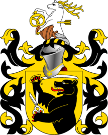 W złotym, wyrastający z lewej strony podstawy tarczy, czarny uzbrojony niedźwiedź. W prawej uniesionej łapie, w pas ułożona srebrna szabla o złotym jelcu.W lewej, srebrne, otwarte nożyce. Klejnot – z czarno złotej nałęczki wyrasta srebrny jeleń o złotych rogach z wbitą w plecy złotą strzałą. Pod pachą trzymający dzban, otworem w skos ku dołowi, z wylewajacą się wodą. W prawej łapie złoty precel ,wsparty na dzbanie. Labry – czarne podbite złotem.