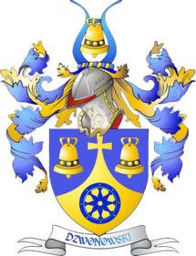 W niebieskiej tarczy herbowej, z podstawy wyrastający wygięty do wewnątrz klin złoty zakończony krzyżem, w towarzystwie dwóch złotych dzwonów, na którym złożono niebieskie koło wozowe. Klejnot niebieskie rogi bawole pomiędzy którymi zawieszono takiż sam złoty dzwon. Labry w barwach niebiesko-złotych.
