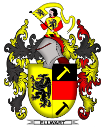 Tarcza herbowa dzielona w słup, prawa w złotym polu uzbrojony czarny gryf, lewa dzielona dwa razy w pas, o barwach czarno-czerwono-złotych. W 1 złoty młotek złożony trzonkiem z lewa w skos, w 3 tak samo złożony czarny młotek. W klejnocie wyrastająca postać męska, w ubraniu złotym z czerwonymi rękawami, z emblematem czarnego gryfa na piersi, zwrócona w prawo, trzymająca chorągiew złotą z czarnym gryfem. Labry, prawa strona w barwach czarno – złotych, lewa czarno – czerwono – złota.