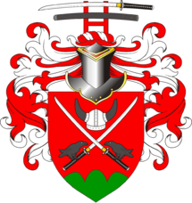 W czerwonym, pomiędzy zielonym trójwzgórzem a hełmem wojownika normanskiego z czarnymi rogami, skrzyżowane dwa miecze samurajskie, na których rekojeściach usadowione dwa kruki, zwrócone do siebie. Klejnot na nałęczce w barwach czerwono-srebrnych, czerwona majuskuła litery H, jako stojak dla katana i saya, którymi została obłożona w pas, rzędem w słup. Labry czerwone podbite srebrem.