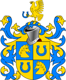 Niebiesko-złota tarcza dzielona w krzyż, w barwach przemiennych. W 1, złota głowa konia zwrócona w lewo, w 4 zwrócona w prawo. W 2 i 3, niebieska podkowa barkiem ku dołowi. Klejnot: Na niebiesko – złotej nałęczce, złoty jastrząb stojący na lewej nodze, trzymający w drugiej, niebieską podkowę barkiem ku dołowi. Labry: niebieskie, podbite złotem.
