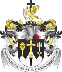W czarnym, srebrna trójgóra o poszarpanych szpicach, przed którą w słup, czarna, zapalona pochodnia o naturalnym płomieniu. Na środkowej szpicy, złoty, wydłużony kawalerski krzyż. Po prawej, złote drzewo dębu, po lewej złoty klucz w słup, o podwójnym grzebieniu. Klejnot: Na czarno-złoto-srebrnej nałęczce, orzeł złoty do lotu w prawo, trzymający w łapie srebrny kłos zboża. Z jego grzbietu wyrasta czarny krzyż, jak w godle. Labry: góra czrne podbite złotem, dół czarne podbite srebrem.. U dołu na wstędze łacińska sentencja SALVUM FAC POPULUM TUUM, DOMINE, ET BENEDIC HEREDITATI TUAE.