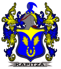 W niebieskiej tarczy, skrócony i wygięty do wewnątrz, złoty klin na opak, z obu stron w towarzystwie złotych liści dębowych, które osadzono pałąkami na ocelonach podkowy, obróconej barkiem ku dołowi. W czeluści podkowy żołądź złoty. Labry w barwach niebiesko-złotych. Klejnot, niebieski kaptur jako nakrycie głowy, zwane kapicą.