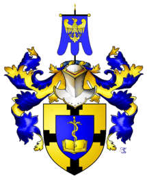 W złotym, czarny krzyż krukwowy obłożony niebieska tarczą na której złota otwarta księga z zaćwieczonym w jej środku złotym eskulapie, oplecionym przez dwugłowego węża takiej samej barwy. Klejnot, niebieska chorągiew kościelna o trzech strefach, na której złoty orzeł Piastów śląskich.