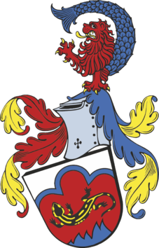 W srebrnej tarczy, czerwona, podniesiona do wysokości głowicy, ograniczona niebieską bordurą trójgóra. Na niej ponad niebieskimi płomieniami w podstawie, skręconą w S salamandrą złożoną w pas, głową ku głowicy. Klejnot, hybryda czerwonego lwa i ryby. Lew o złotych pazurach i takiej samej barwy języku, oparty jedną łapą na hełmie, druga podniesiona. Z jego dolnej, tylnej części wyrastający, niebieski rybi ogon, zawinięty ku górze ponad głową. Labry prawe, czerwone podbite złotem, lewe, niebieskie podbite złotem.