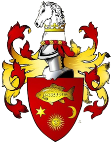 W czerwonym, w pozycji podstawy, złote słońce w towarzystwie z prawej górnej, złota sześcioramienną gwiazdą, z lewej górnej złoty księżyc w nowiu, z obliczem. Powyżej złoty karp. Klejnot, biała końska głowa ze złotą koroną na szyi. Labry czerwone podbite złotem.