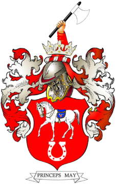 Na czerwonej tarczy, ponad srebrną podkową w podstawie, barkiem ku dołowi, srebrny koń z niebieskim siodłem i złotym napisem Maj ponad takimż sercem. Labry: czerwone podbite srebrem. Klejnot: z czerwono-srebrnej nałęczki, wyrasta zbrojna ręka, przechodząca przez srebrną koronę, trzymająca w dłoni topór, obuchem ku górze. Pod tarczą na wstędze zawołanie złożone z dwóch słów Princeps May.