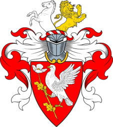 W czerwonym, srebrny gołąb w locie, trzymający złotą łodygę kwiatu maku, o dwóch takiej samej barwy listkach i srebrnym kielichu. Z nałęczki w barwach przemiennych czerwono-srebrnych wyrastają wspięte, od siebie, postacie srebrnego rumaka i złotego lwa. Labry, czerwone podbite złotem.