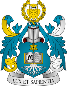 Na niebieskiej tarczy, złota sześcioramienna gwiazda ponad otwartą księgą srebrną z oprawą i zdobieniami złotymi, z czarną majuskułą litery M na prawej karcie, złożoną na srebrnym karczu. Klejnot: na nałęczce niebiesko-srebrno-niebiesko-złotej, złoty otwarty wieniec, z prawej z liści dębowych, z lewej z liści laurowych. Pośrodku złota sowa na wprost. Labry: prawe, niebiesko-złote, lewe niebiesko-srebrne. U dołu maksyma LUX ET SAPIENTIA.