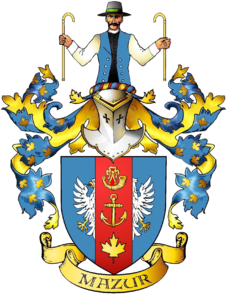 W niebieskiej tarczy srebrny uzbrojony orzeł, rozdzielony czerwonym słupem na którym pomiędzy złotym rogiem myśliwskim u góry a złotym liściem klonu u dołu złożono złotą kotwicę. W klejnocie, nad złoto-błękitno-czerwonym zawojem, wyrastająca postać wąsatego mężczyzny w mazurskim stroju, białej koszuli, z nałożonymi kamizelami czarną, spodnią i błękitną wierzchnią, w szarym stożkowym kapeluszu, z czerwono zieloną opaską, w dłoniach dzierżącego w połowie długości złote laski zagiętymi uchwytami u góry, ku sobie. Labry błękitne usiane złotymi liśćmi klonu, podbite złotem.