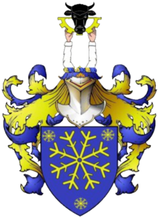 Na niebieskim, złota duża gwiazda płatka śniegowego w towarzystwie trzech mniejszych, dwie w kątach górnego obszaru głowicy, jedna w obszarze podstawy tarczy, na dnie. Klejnot: dwie wyprostowane ręce w białych rekawach trzymające wysoko pół koła młyńskiego. na którym zawieszono głowę wołu w barwie czarnej.