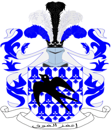 W tarczy, futro w łasice niebiesko srebrne posiane ogonkami gronostajowymi w barwach zmiennych futra, na którym złożona jaskółka czarna w locie wznoszącym w prawo skos. Na hełmie ozdobionym niebiesko srebrnymi labrami, czarna korona hełmowa z której wyrasta pięć piór strusich: zewnętrzne niebieskie, środkowe czarne w towarzystwie srebrnych. U dołu wstęga z mottem: إقغز الفوق (lataj wysoko).