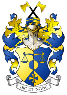 W złoto niebieskiej tarczy dzielonej w słup, w podstawie skrócona szpica dzielona linią cięcia, na której krzyż kawalerski. Na wierzchołku szpicy osadzony bizant, uwieńczony ramionami wagi szalowej, wszystko w barwach naprzemiennych. Klejnot, na nałęczce w barwach złoto niebieskich, toczek walcowaty z nałożonym symbolem Różańca Św.,w barwach przemiennych w słup, niebiesko złotych, na którym osadzone dwa skrzyżowane w krzyż ukośny topory złote o styliskach czarnych. Labry niebieskie, podbite złotem. Dewiza "Hic et nunc".