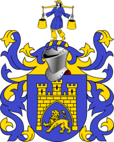 Na niebieskiej tarczy, kroczący lew w prześwicie bramy murów miejskiej o trzech blankowanych wieżach, środkowa wyższa. Wszystko w barwie złotej. Klejnot: Krocząca, bosa, męska postać w złotym kapeluszu, niebieskim kittelu i złotych sfatygowanych spodniach. Na ramionach nosidło z dwoma złotymi czerpakami. Labry niebieskie, podbite złotem.
