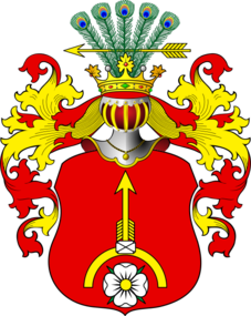 Na czerwonym, złota, opierzona strzała, w słup bełtem ku górze, wsparta na półpierścieniu o srebrnym kamieniu, który ponad białą, czteropłatkową różą o złotym wzniesieniu, złożoną w podstawie. Klejnot, na hełmie z koroną wyrastający pęk pięciu pawich piór przeszyty złotą strzałą, w pas. Labry czerwone podbite złotem.