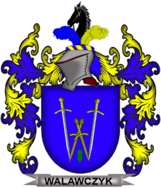 W niebieskiej tarczy herbowej, zwrócone ostrzami ku dołowi, dwa złote miecze z dwoma złotymi sztyletami, skrzyżowane ostrzami, tworzące literę W. Pomiędzy sztyletami szyszka chmielu złożona. Klejnot, czarna głowa końska zwrócona w prawo, wyrastająca pomiędzy dwoma piórami strusimi o barwach niebiesko-złotych. Labry niebiesko-złote.