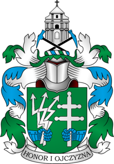 W zielonym, ze skraju tarczy w obszarze podstawy, wyrastają zbrojne ręce w barwie niebieskiej, trzymające: z prawej, trzy srebrne błyskawice w wachlarz, skierowane ku górze, z lewej, srebrny, podwójny lotaryński krzyż kulowy. Klejnot: na zielono-srebrno-niebieskiej nałęczce, krzyżem w skos, dwa młotki, lewy murarski, prawy szewski, o niebieskich obuchach i czarnych trzonkach, które ograniczają na nich złożony fronton świątyni (klasztoru Salezjanów z Lutomierska) Labry: w barwach przemiennych, zielono-niebiesko-zielone podbite srebrem. U dołu na wstędze maksyma Honor i Ojczyzna.