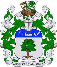 Na srebrnej tarczy, pod niebieską głowicą na której rzędem w pas, cyrkiel, strug i kątownik mierniczy złożono, drzewo liściaste ukorzenione,w barwach naturalnych. Klejnot: na nałęczce srebrno-zielonej, łódź drewniana w której smok barwy zielonej trzymający w łapach harfę irlandzką. Labry: zielone podbite srebrem. Na wstędze motto rodziny Zawsze po twojej stronie.