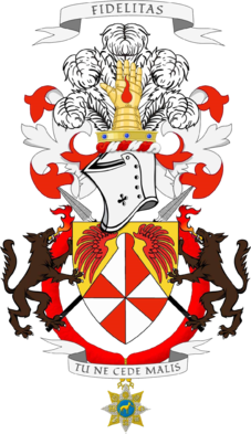 Tarcza typu europejskiego, przytrzymywana przez dwa brunatne, wspięte psy ze srebrnymi pazurami i zębami, z których pysków zieją złoto-czerwone płomienie. Za nią, dwie skrzyżowane dzidy afrykańskie. Godło herbowe utworzone zostało poprzez cięcie złotej tarczy, obniżoną krokwią, przeklinowaną w barwach przemiennych srebrno – czerwonych, zakończoną wyciągniętą kulą, w towarzystwie dwóch skrzydeł barwy czerwonej, złożonych w obszarze pierwszej i drugiej ćwiertni. Kleinot: na nałęczce w barwach srebrno-czerwonych, złożona złota korona rangowa stosowana dla odznaczenia zasadności nadanego herbu, wysadzana trzema niebieskimi kamieniami, z której wyrasta złota rękawica zbrojna, po której pośrodku spływa czerwona kropla krwi. Całość umieszczona przed pięcioma srebrnymi strusimi piórami. Labry: czerwone podbite srebrem. U góry ponad herbem umieszczono słowo w formie łacińskiej FIDELITAS. U dołu pod sentencję TU NE CEDE MALIS na wstążce otaczającej tarczę herbową zwisającej gu dołowi, zawieszony królewski order złotego psa ziejącego ogniem.