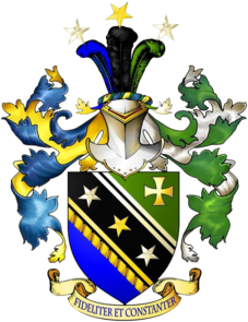 W tarczy dwudzielnej w skos zielono niebieskiej trzy gwiazdy pięcioramienne, srebrno-złoto-srebrna na skosie czarnym o skrajach: dół, skraj złoty podpartym wężykiem generalskim takiej samej barwy, góra srebrny podwójny skraj. W zielonym złoty krzyż kawalerski. Klejnot, na zawoju w barwach niebiesko złotych, pomiędzy trzema strusimi piórami, niebiesko czarno zielone z zaćwiczonymi od góry gwiazdami pięcioramiennymi o barwach i kolejności jak w tarczy. Labry: prawe niebieskie podbite złotem, lewe zielone podbite srebrem. Poniżej tarczy dewiza FIDELITER ET CONSTANTER.