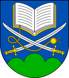 W polu niebieskim nad trójwzgórzem zielonym, dwie karabele o ostrzach srebrnych i rękojeściach złotych, w krzyż skośny, ponad ich skrzyżowaniem otwarta księga o kartach srebrnych i oprawie złotej, z której zwisa takiż sznur, przepleciony przez szable, z pętlą na prawo od skrzyżowania szabel, zakończony okrągłą pieczęcią złotą na lewo od skrzyżowania szabel.